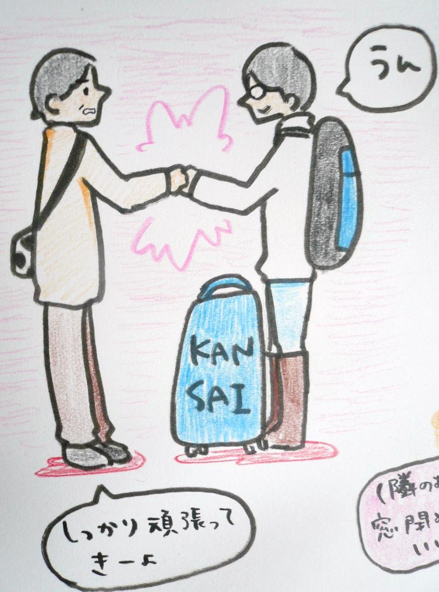 出国ゲート前で、母と握手して別れました。